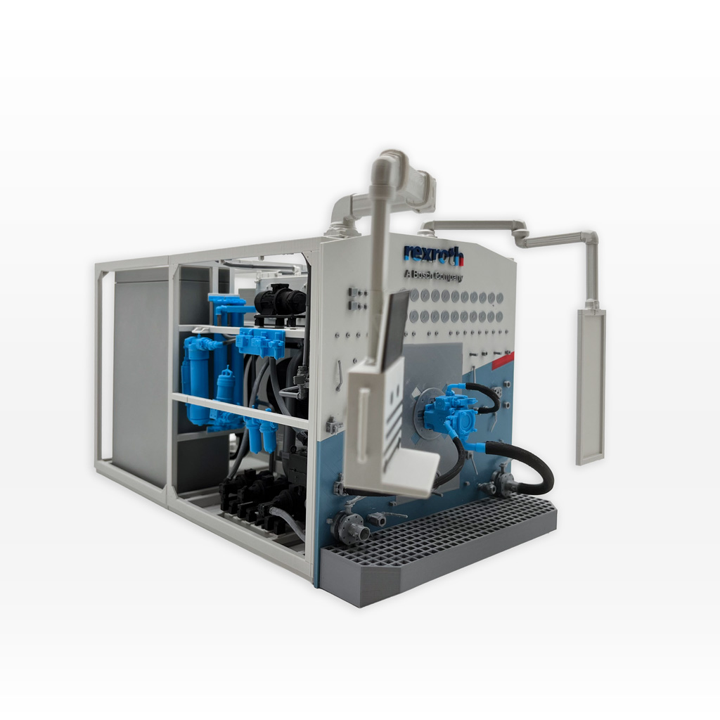 Samotná výroba byla časově náročná — model vznikal z desítek samostatných částí, z nichž mnohé se tiskly dlouhé hodiny, a to v nastavení zaměřeném na kvalitu povrchu, nikoli rychlost. Vzhledem k tomu, že šlo o výstavní kus, hrála roli především čistota tisku, přesnost tvaru a sladění barev. Výrazná modrá na hydraulických modulech, šedé a světle šedé konstrukce i kontrastní panel s logem Rexroth vyžadovaly pečlivé rozložení barevných segmentů přímo při tisku nebo následné ruční doladění tak, aby výsledek působil harmonicky.
